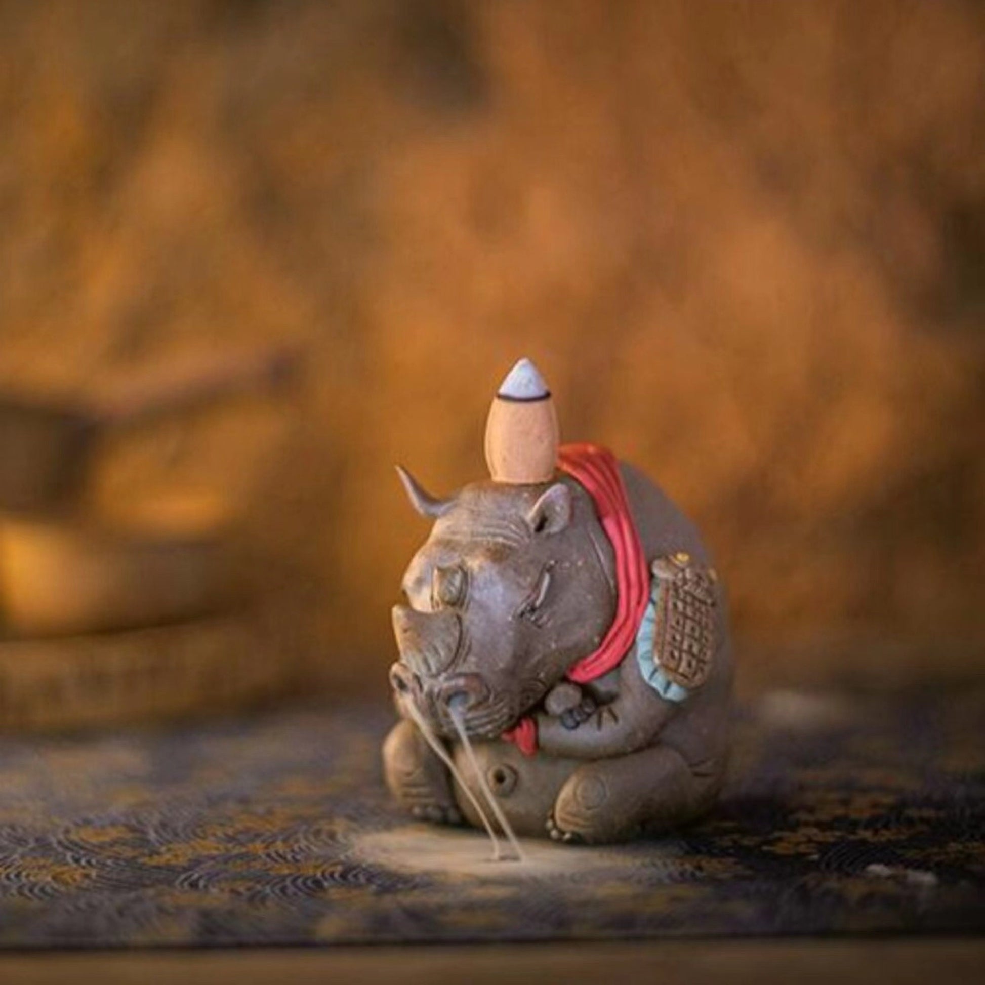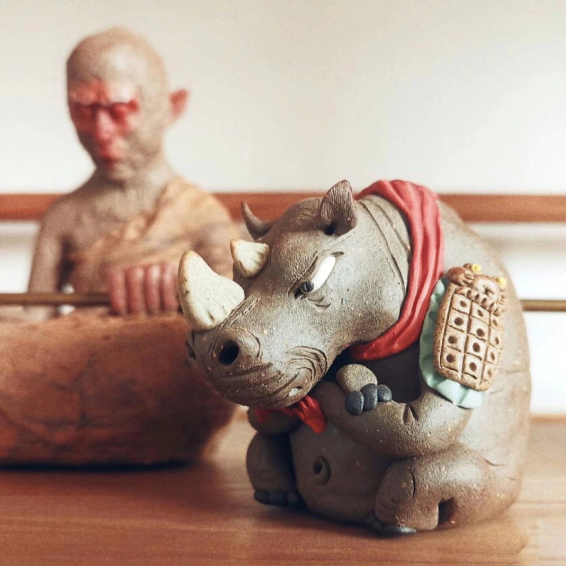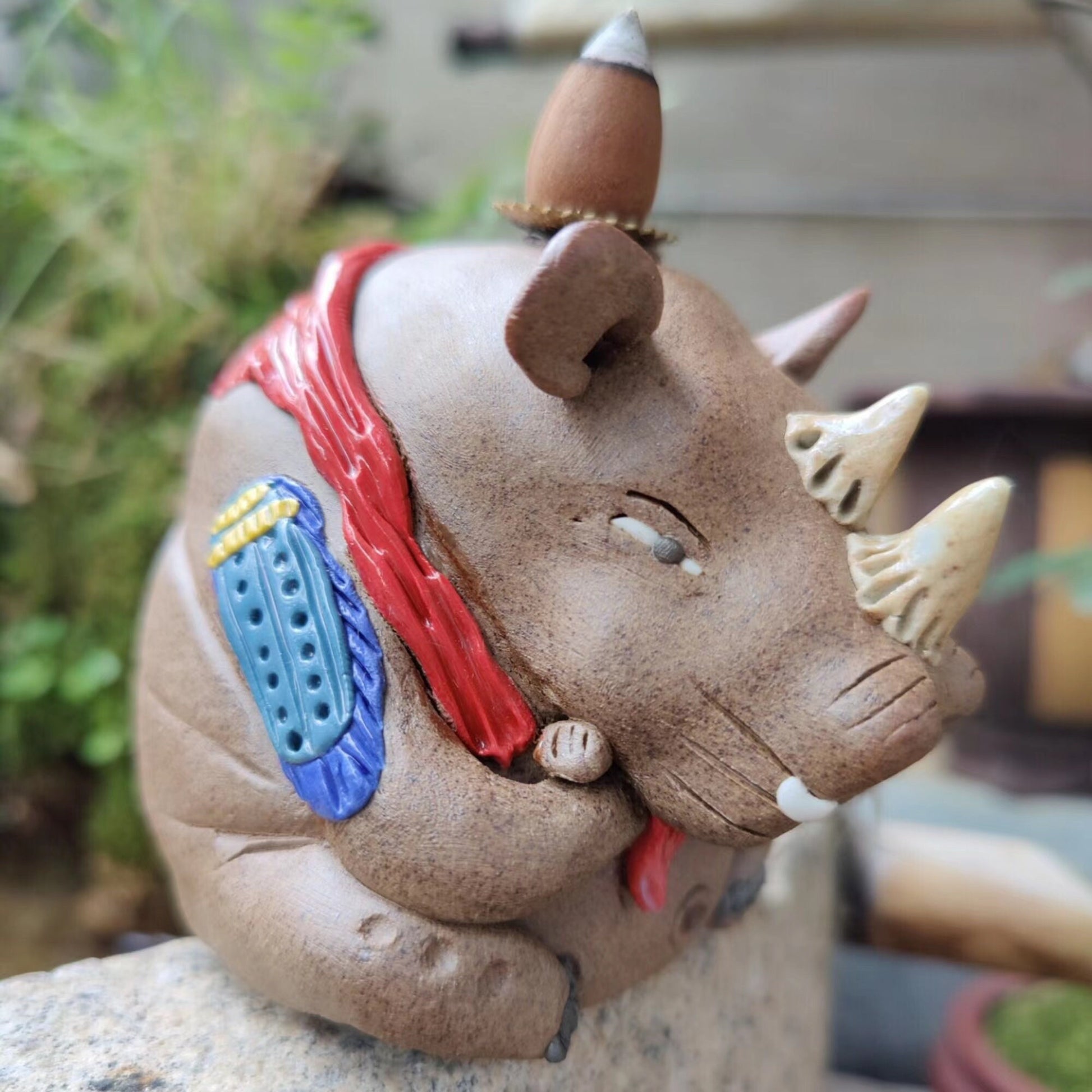 The design was inspired by the rhino, and I wanted to design it as an angry rhino to calm it through meditation, just like us in life, and I am a meditation practitioner myself. I will use the incense burner when practicing meditation, and this one is very lovely and done purely by hand.