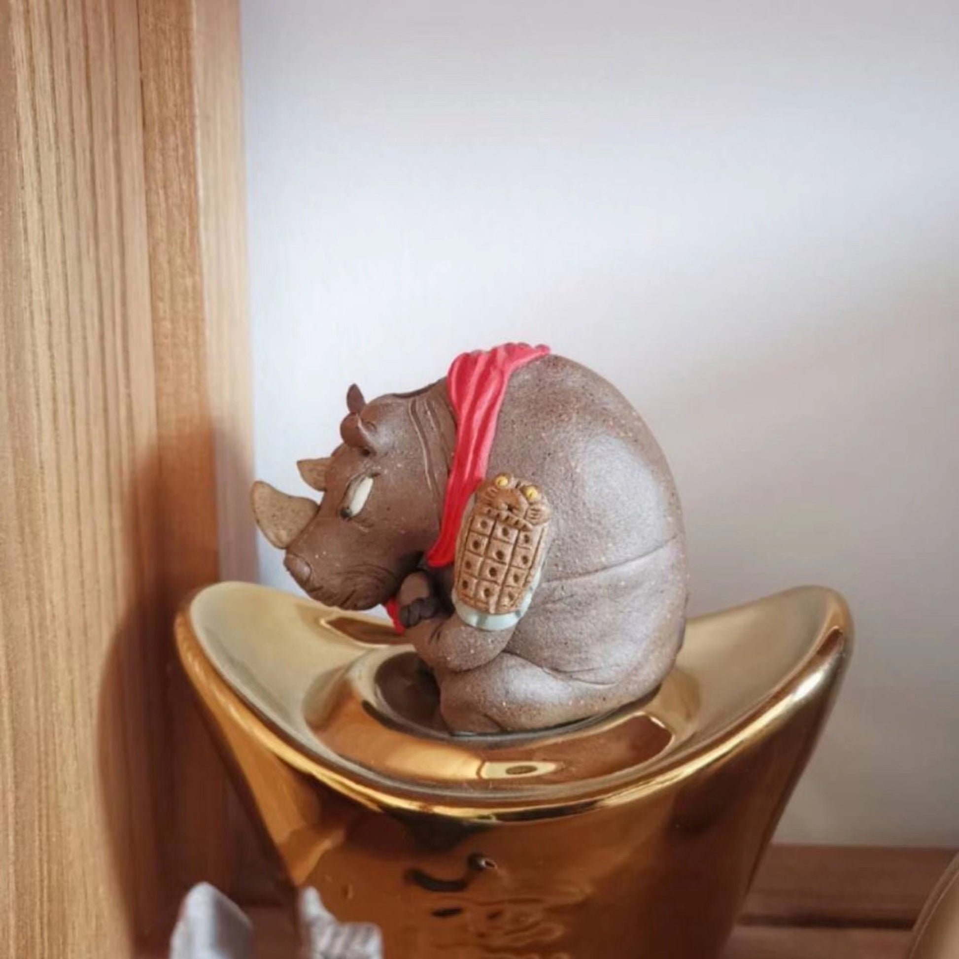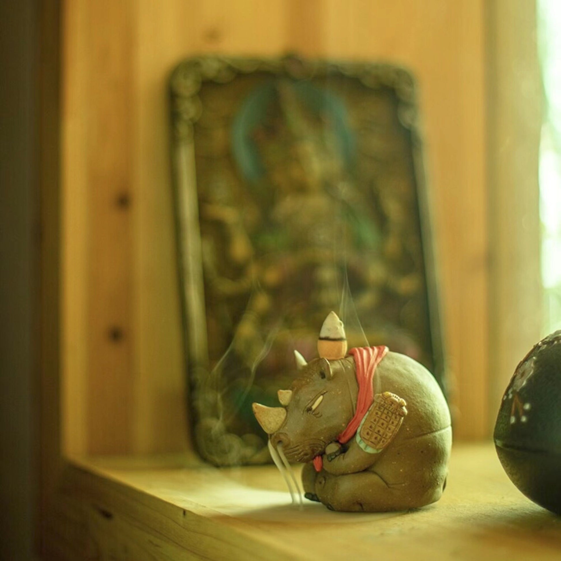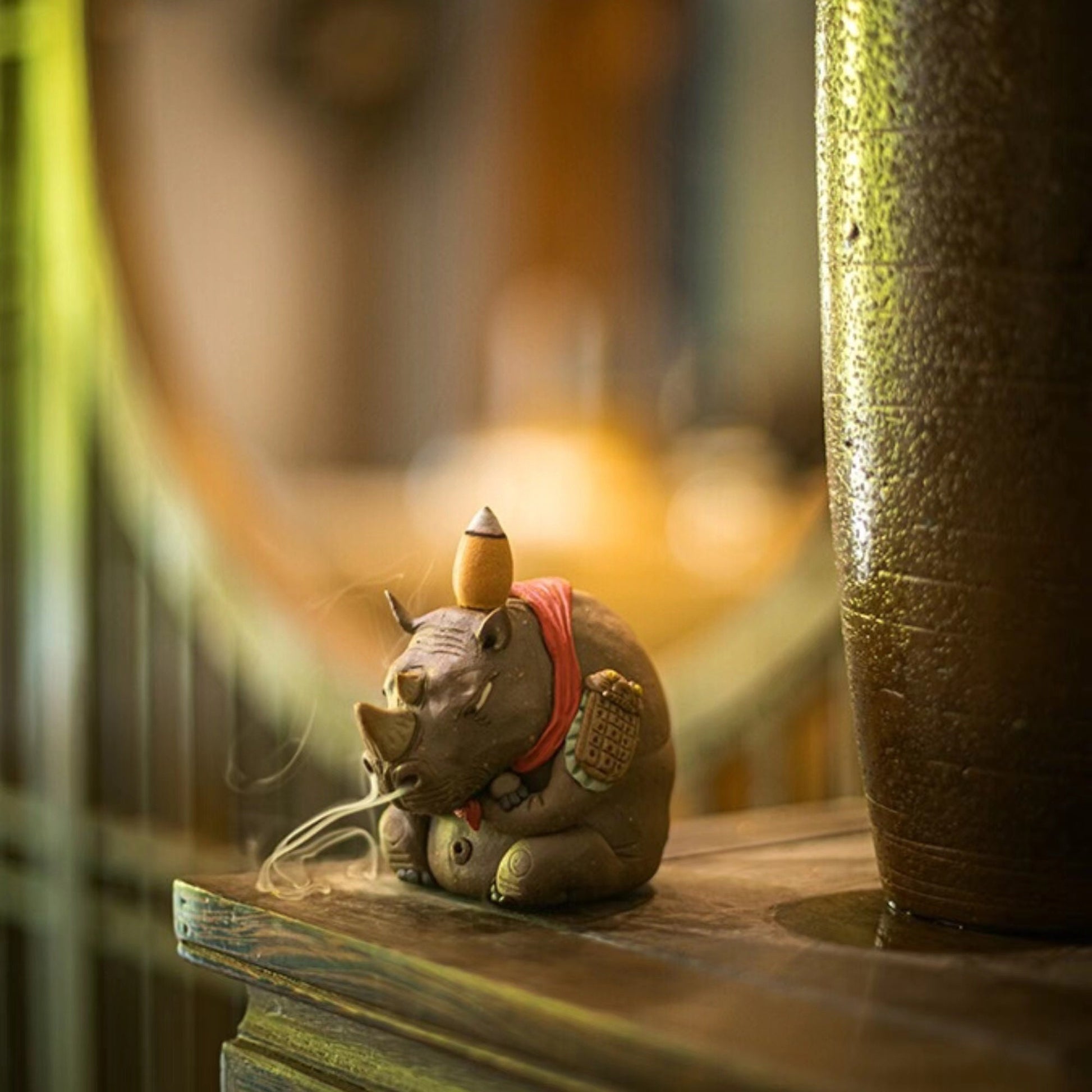 The design was inspired by the rhino, and I wanted to design it as an angry rhino to calm it through meditation, just like us in life, and I am a meditation practitioner myself. I will use the incense burner when practicing meditation, and this one is very lovely and done purely by hand.