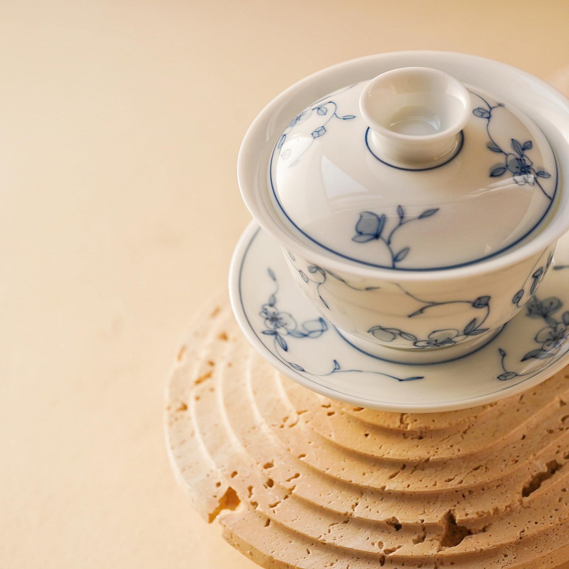 Blue and White Porcelain Gaiwan, Chinese Tea Cup with Lid and Saucer, Gongfu Tea Set, Elegant Floral Design, Unique Gift for Tea Lovers