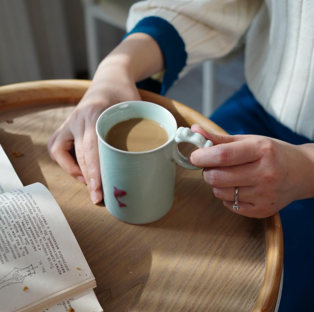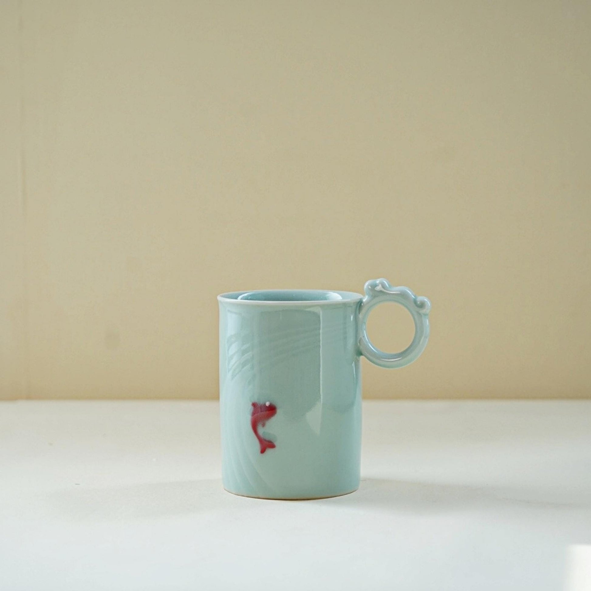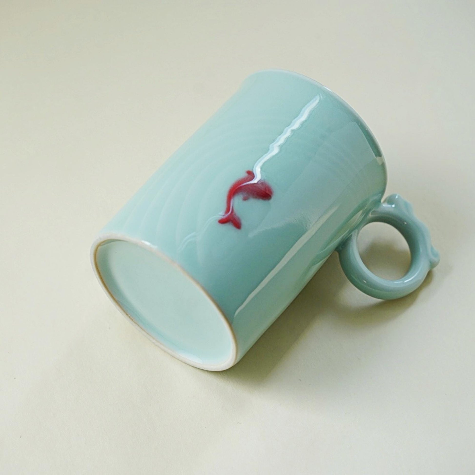 Celadon Mug with Red Fish — Handmade 350ml Chinese Ceramic Coffee Cup | Wabi Sabi Aesthetic | Minimalist Tea Mug | Gift for Her or Him
