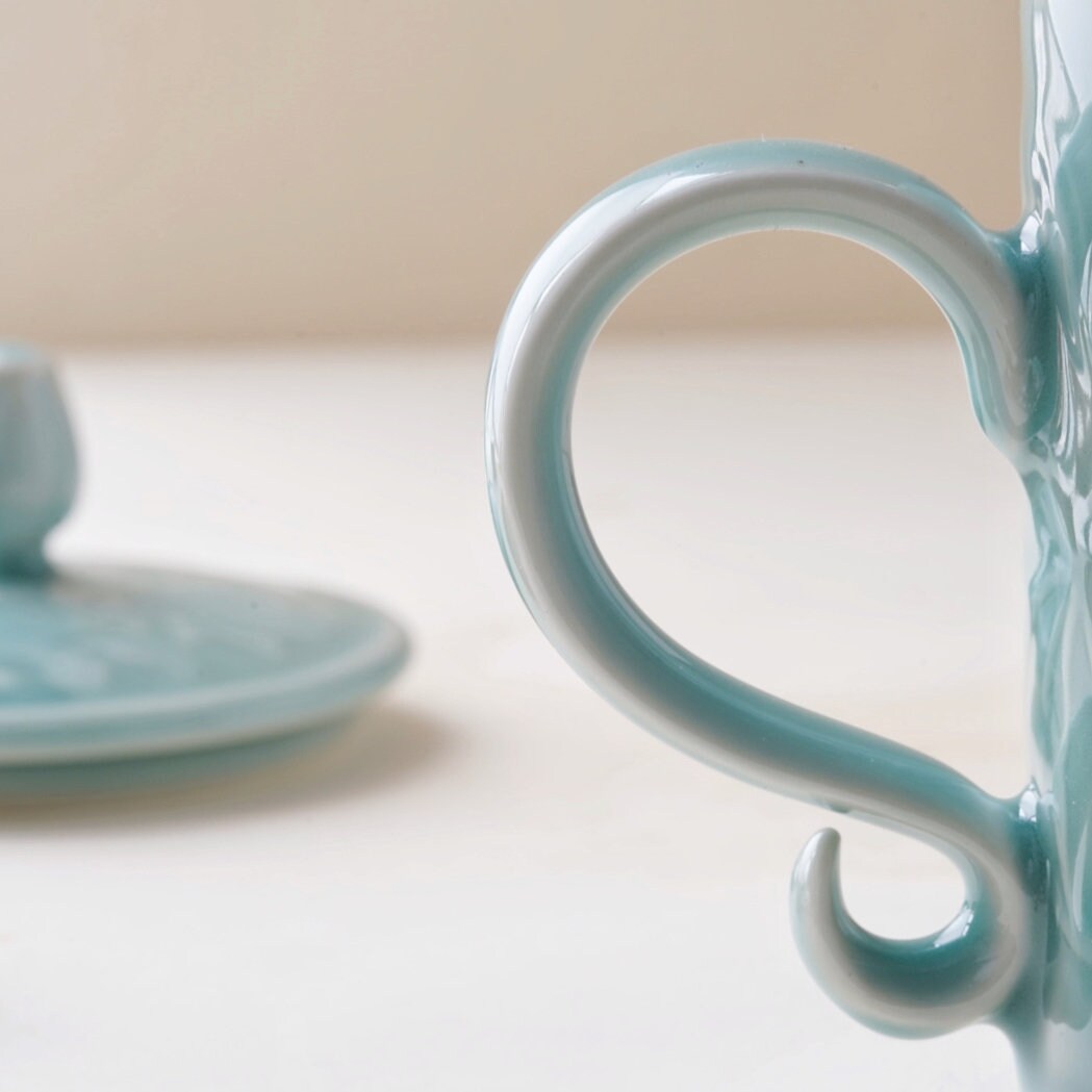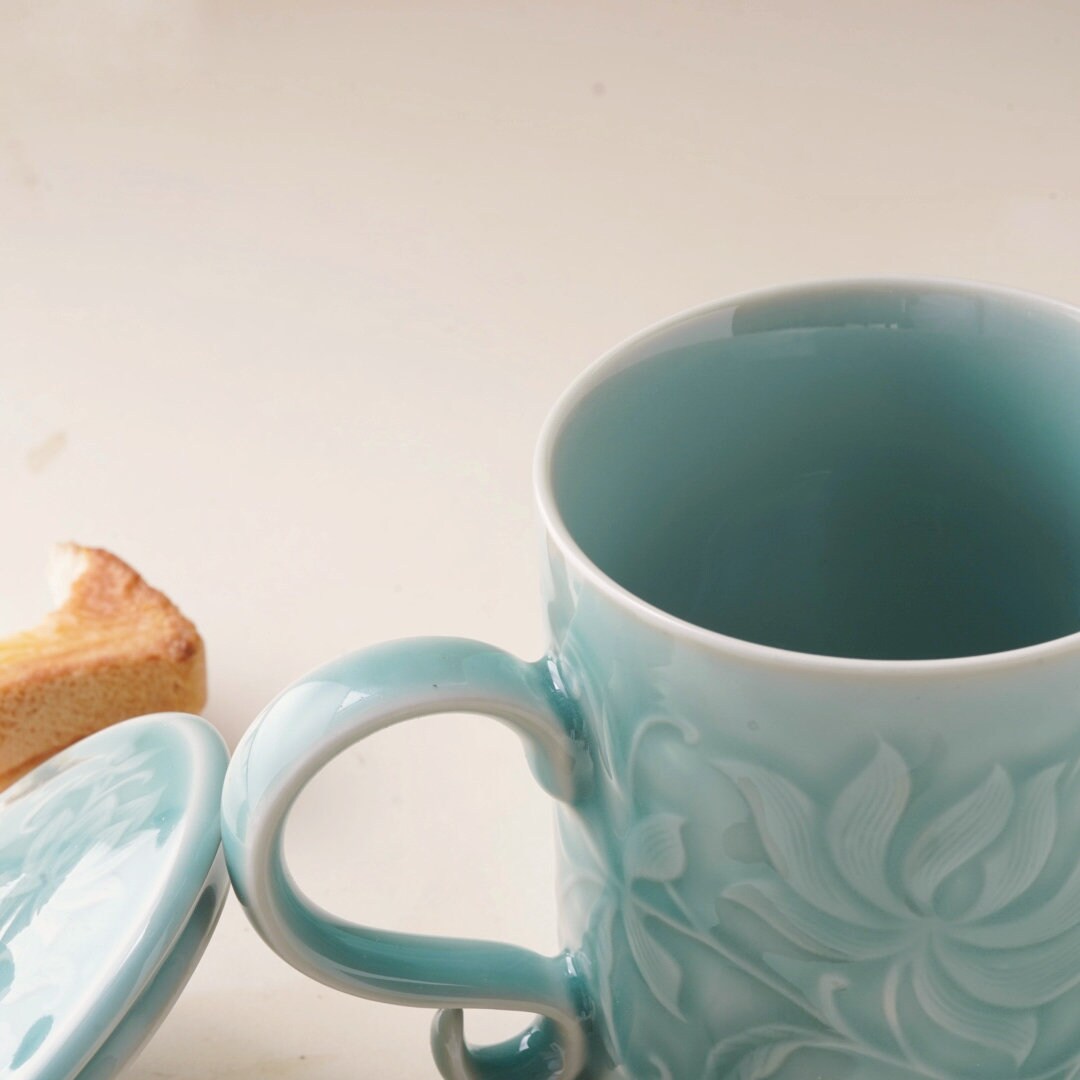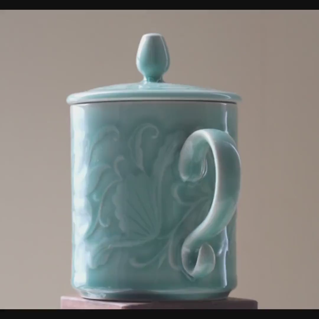 Experience the blend of art and nature with our 300ml Lotus Celadon Mug. Inspired by the serene lotus flower, each mug is hand-carved, featuring a unique S-shaped handle and artist's signature at the base.