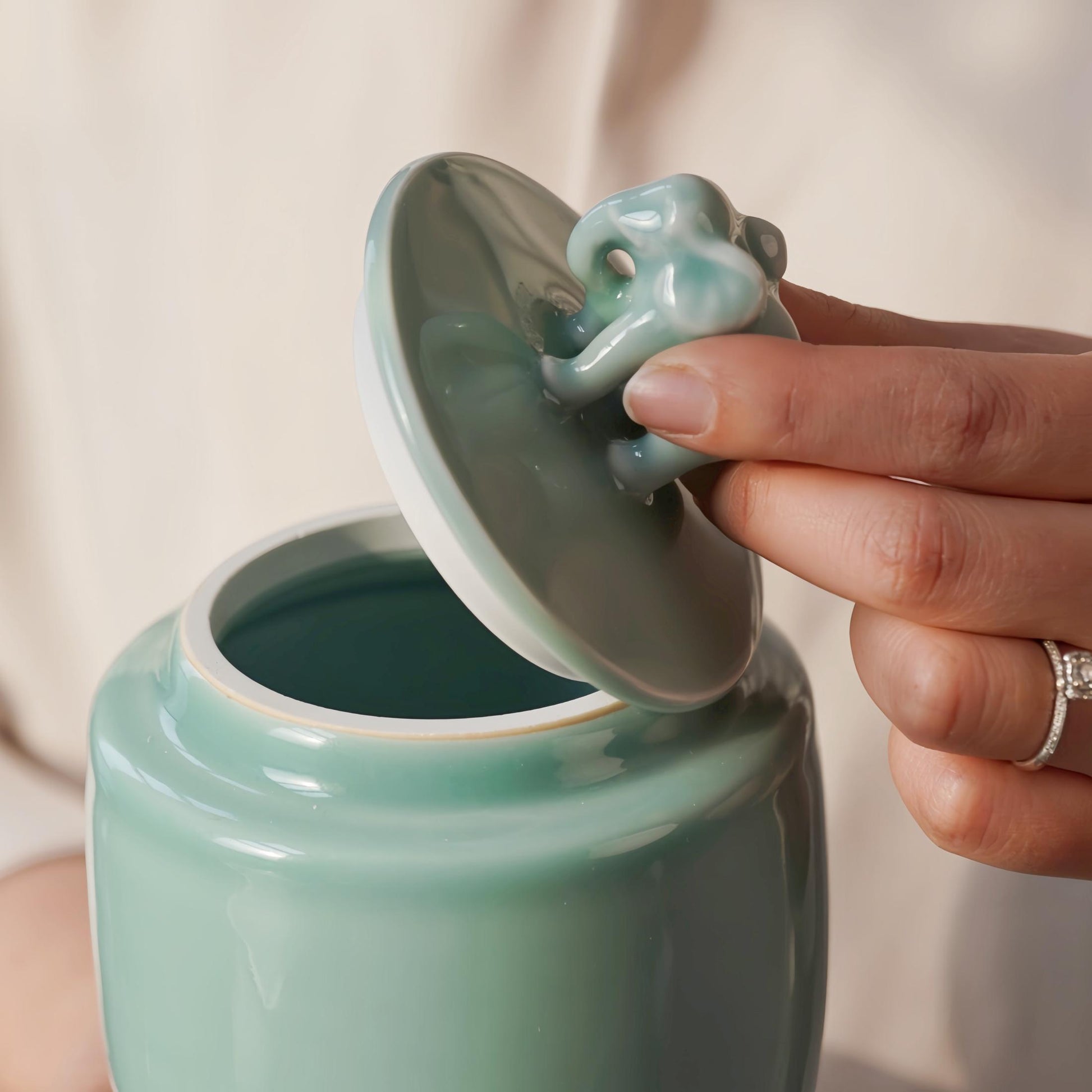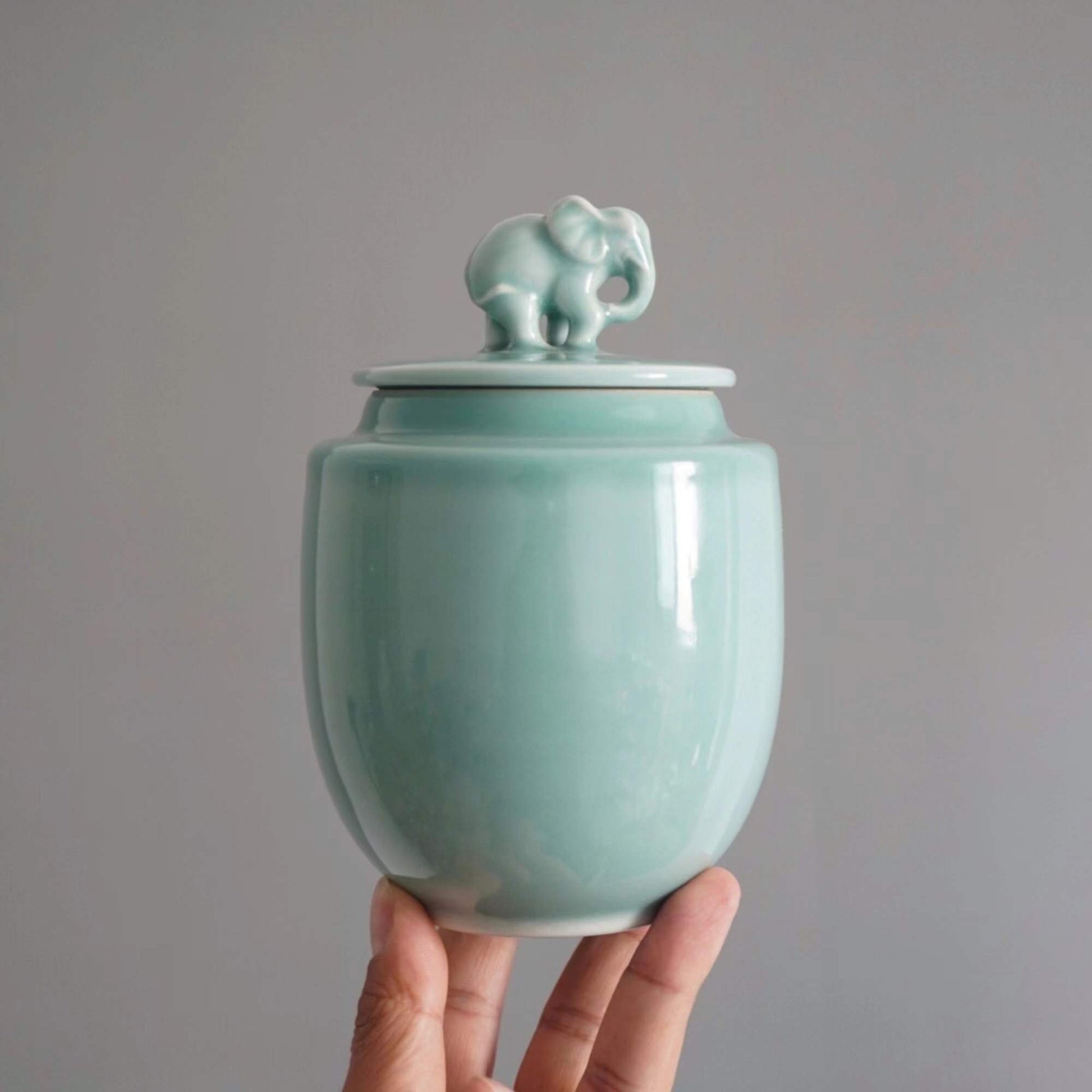 Bring elegance and cultural charm to your kitchen or living space with this 700ML handcrafted Longquan Celadon jar. Adorned with a graceful elephant lid, this ceramic container is ideal for storing tea, coffee, spices, or small treats while doubling as a decorative centerpiece. Though not fully airtight, its snug-fitting lid helps maintain freshness for dry ingredients, making it both beautiful and practical.
