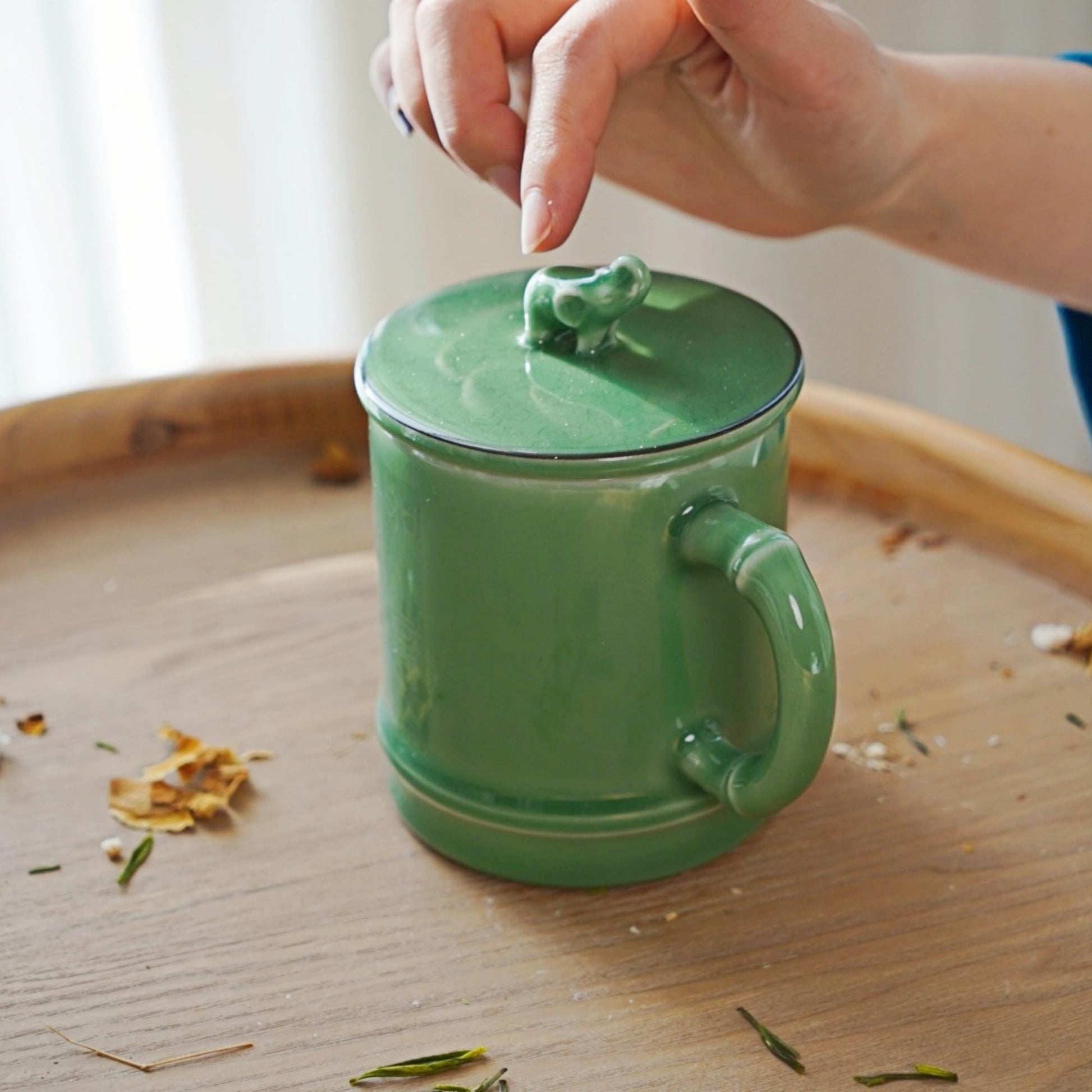 Elephant Lid Celadon Mug with Handle – 13oz Longquan Celadon Tea Mug | Handmade Chinese Ceramic Coffee Cup | Minimalist Wabi Sabi Drinkware