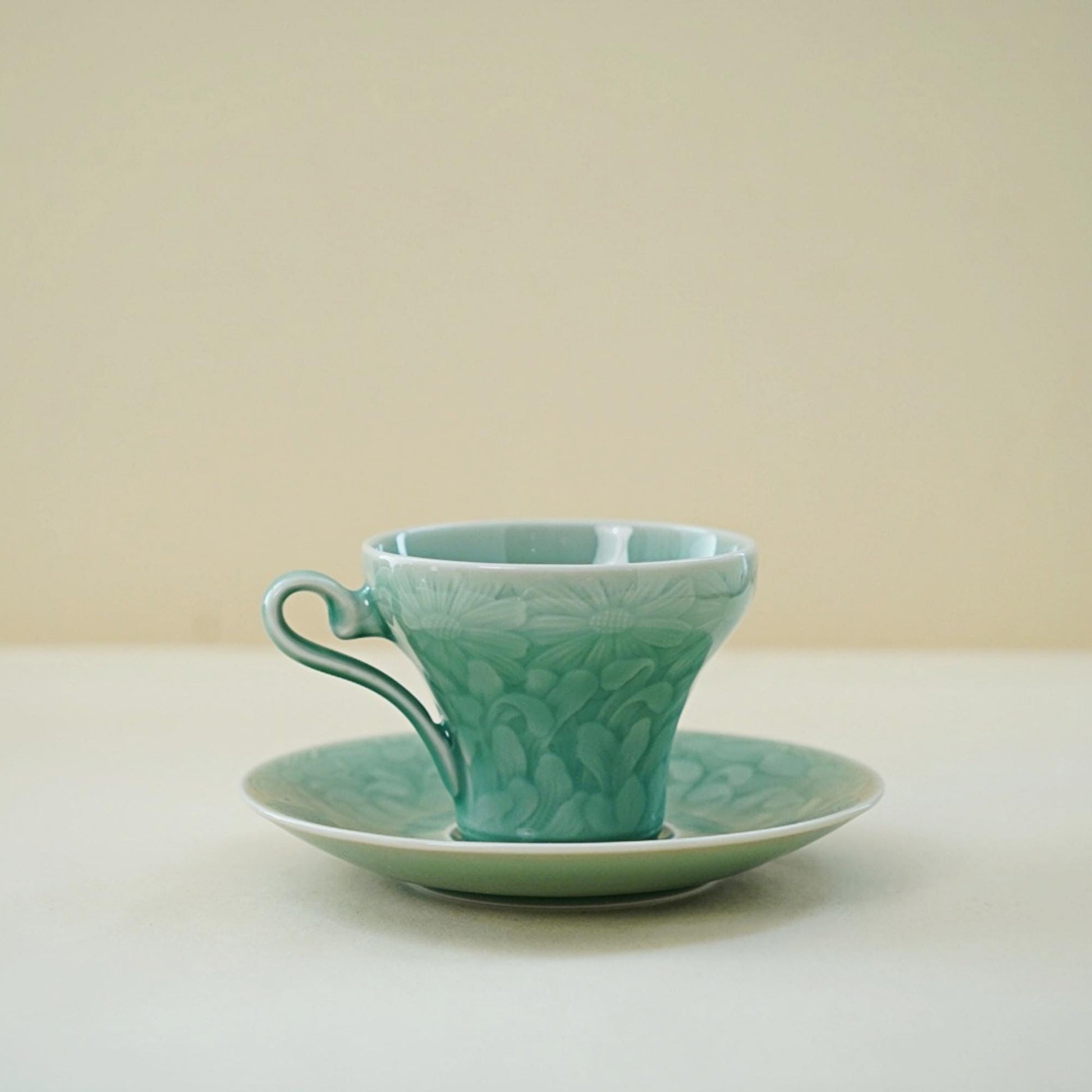 Each piece is meticulously crafted using the centuries-old high-temperature firing process, creating the signature translucent jade-green glaze. The minimalist yet intricate floral design symbolizes elegance, vitality, and warmth, making it a unique addition to your drinkware collection.