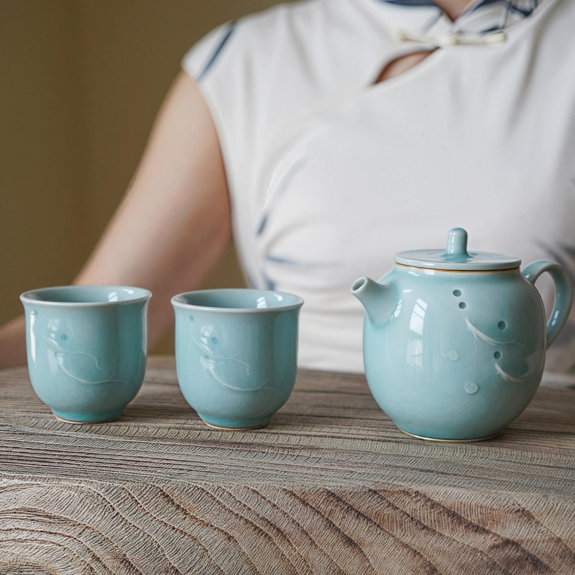 Handmade Longquan Celadon Tea Set, Elegant Ceramic Teapot with Two Cups, Personalized Gift, Customizable Chinese Pottery Gift