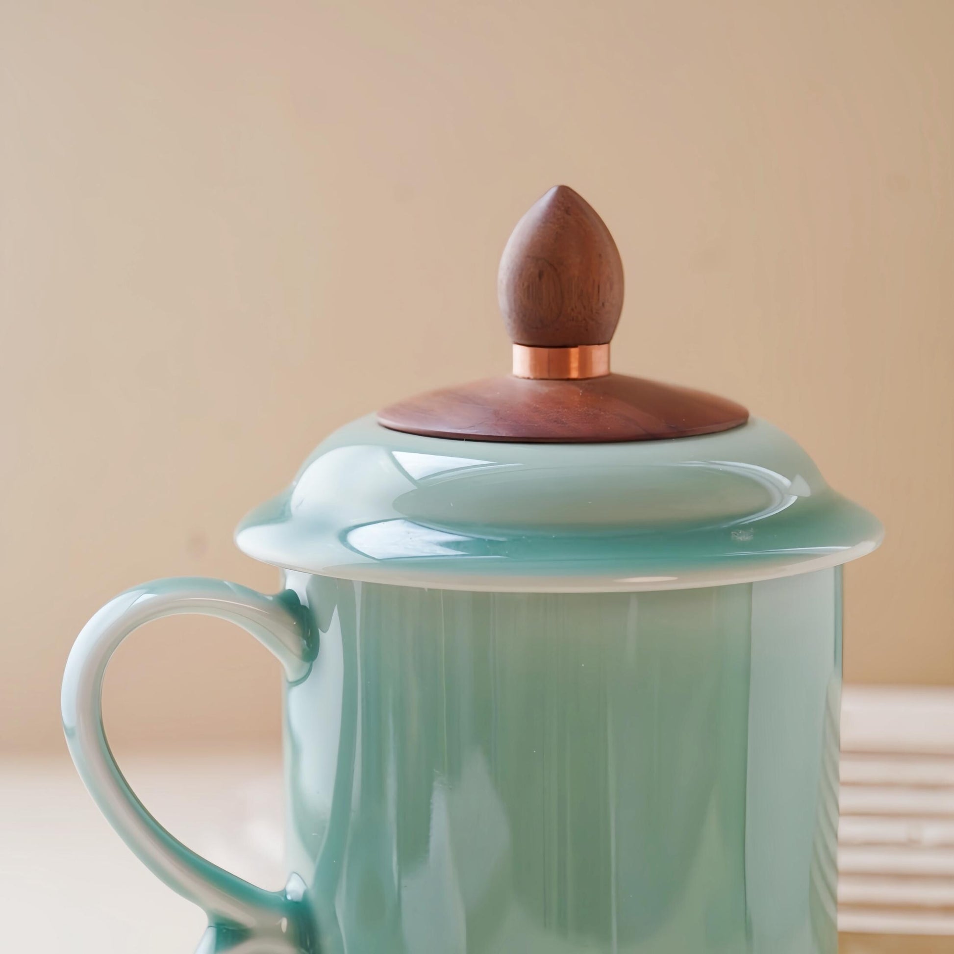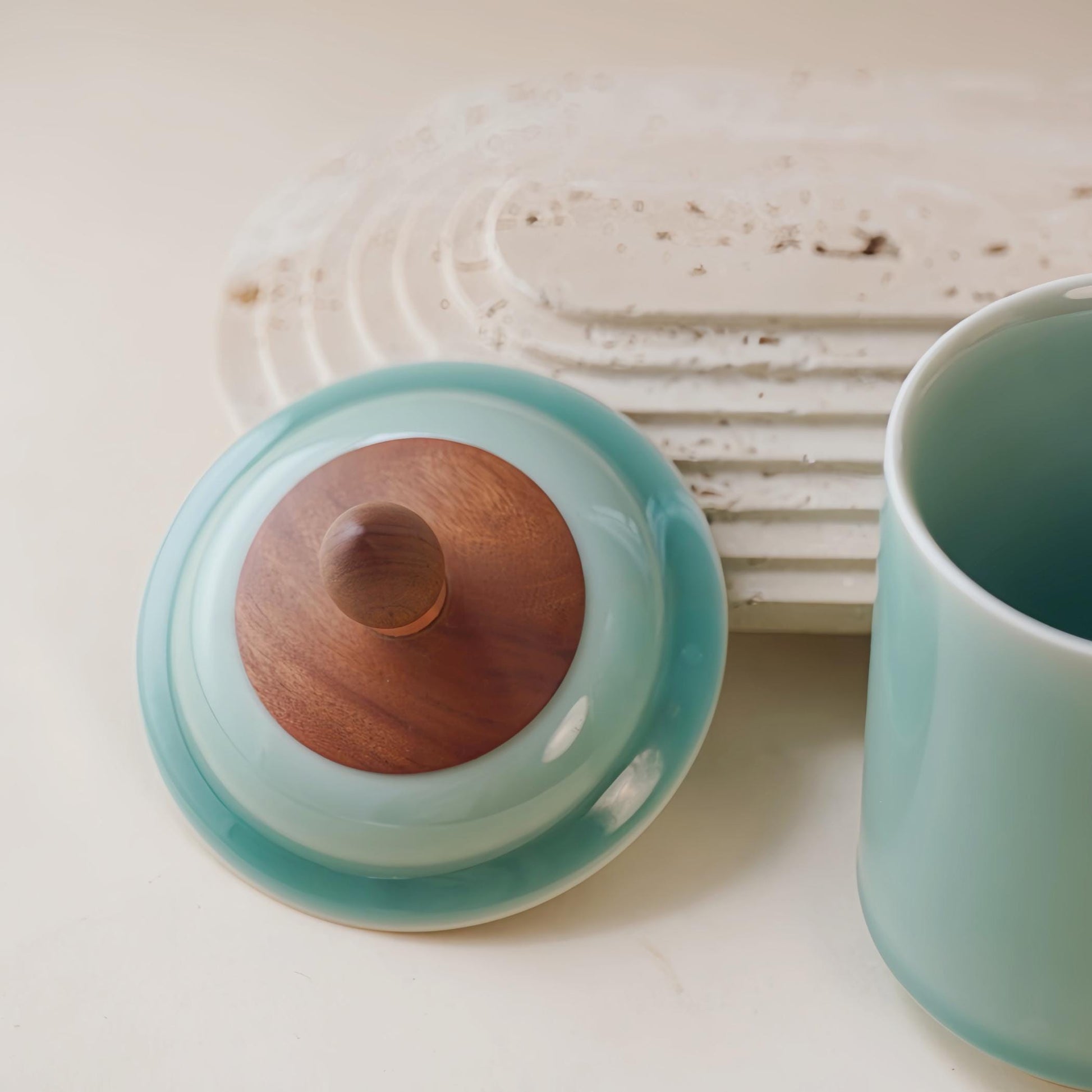 Premium Materials: The mug features a luminous celadon ceramic body paired with a natural wooden lid and handle, offering both elegance and functionality.