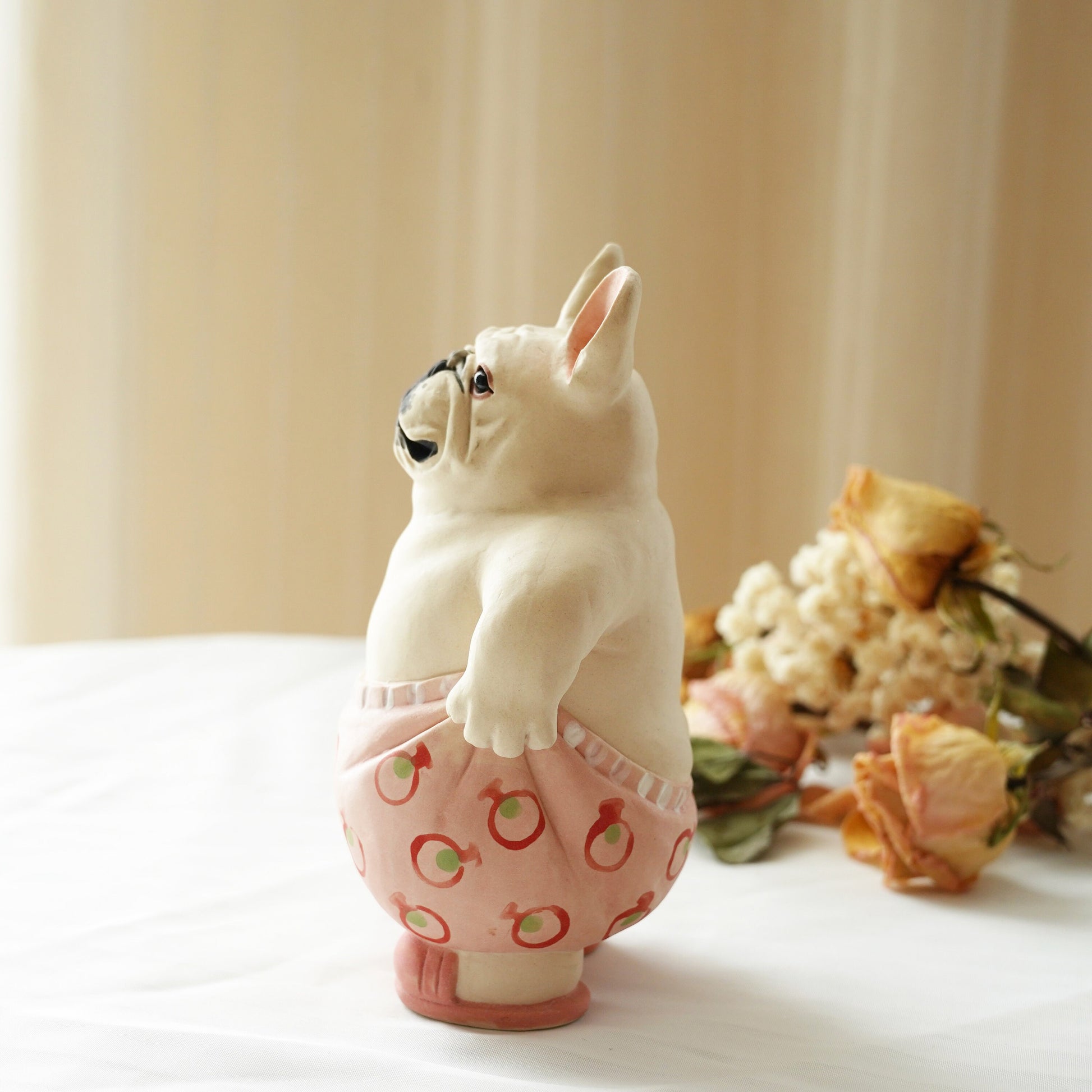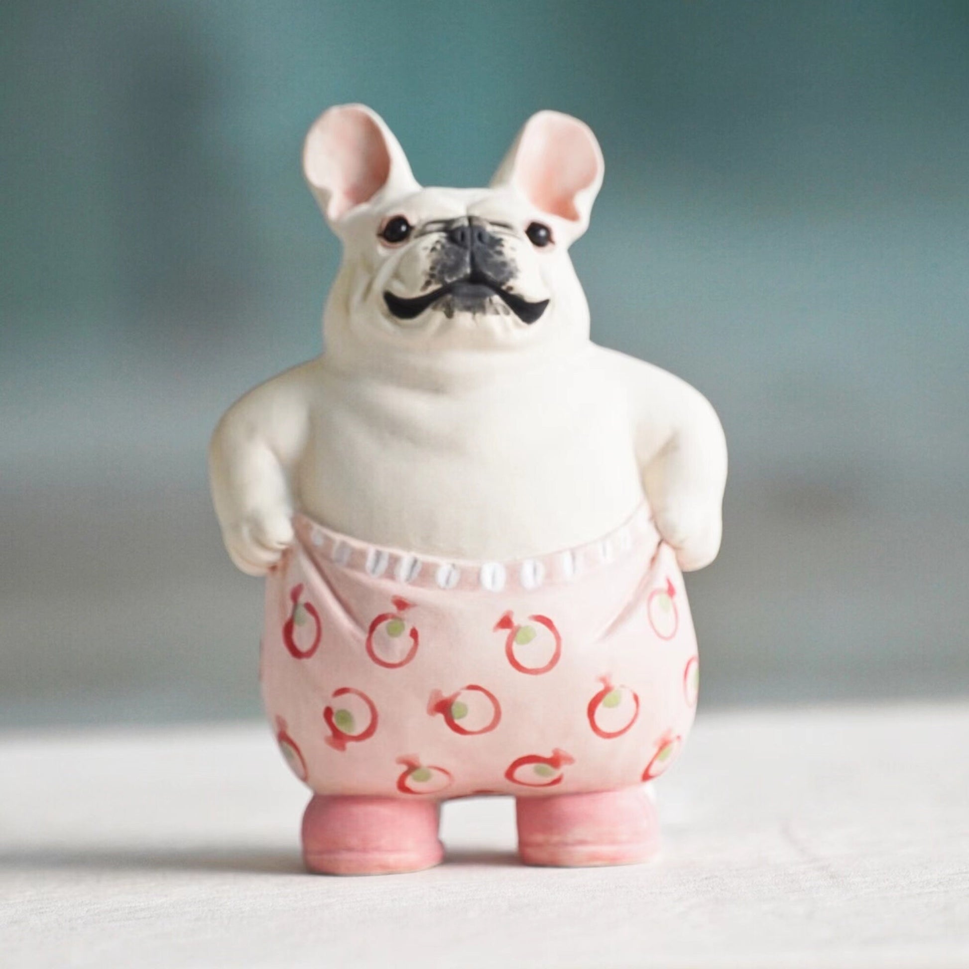 LONG QUAN CELADON - Adorable Handcrafted French Bulldog Sculpture - 5-inch Tall - Playful Pink Pants Pose - Unique Gift